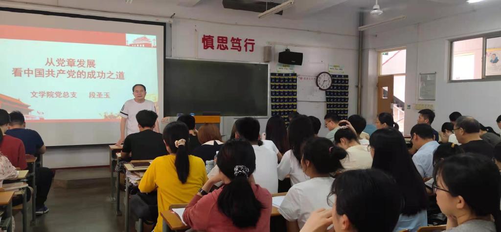 段圣玉从革命时期、建设时期、改革时期、复兴时期向师生党员们讲述了党章的发展历程,深刻指出党章指引、见证并展现了我们党成长、成熟、发展、壮大的光辉历程,党章是我们党奋斗历史的概括总结和高度浓缩,是全党必须共同遵守的根本行为规范。同时,段圣玉从理论武器、力量来源、正确领导三个关键所在讲述了中国共产党的成功之道,对党在各个历史时期的光辉历程、理论成果、宝贵经验和伟大精神进行了深刻阐释。