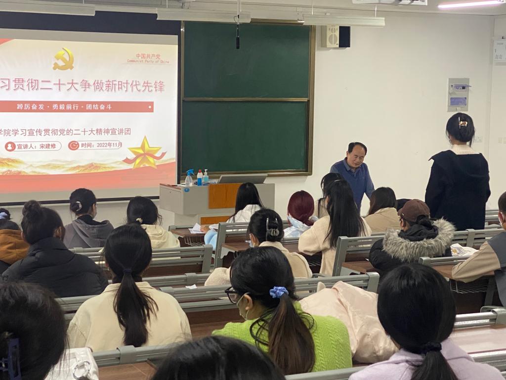 11月20日下午,SUNBET申博党的二十大精神宣讲会在新城校区增信楼3418室举行,院党总支书记宋建修为党员干部和学生代表讲“第一课”。
