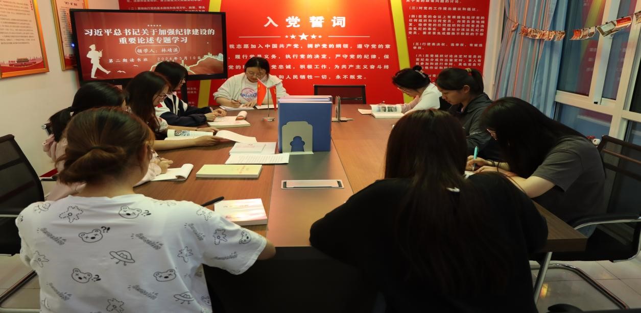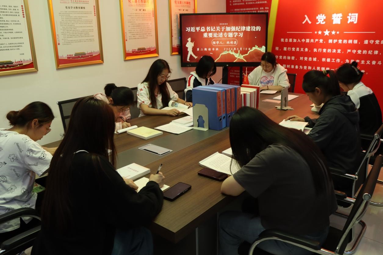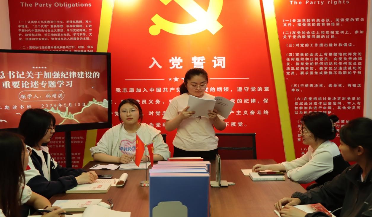 为深入学习贯彻习近平总书记关于加强纪律建设的重要论述,进一步落实全面从严治党要求,加强党员的党性修养,强化纪律意识,5月10日,SUNBET申博学生党员在“一站式”党团活动室开展了第二期党纪学习教育读书班活动,学生党员庄琪和林靖淇带领十位入党积极分子进行学习。