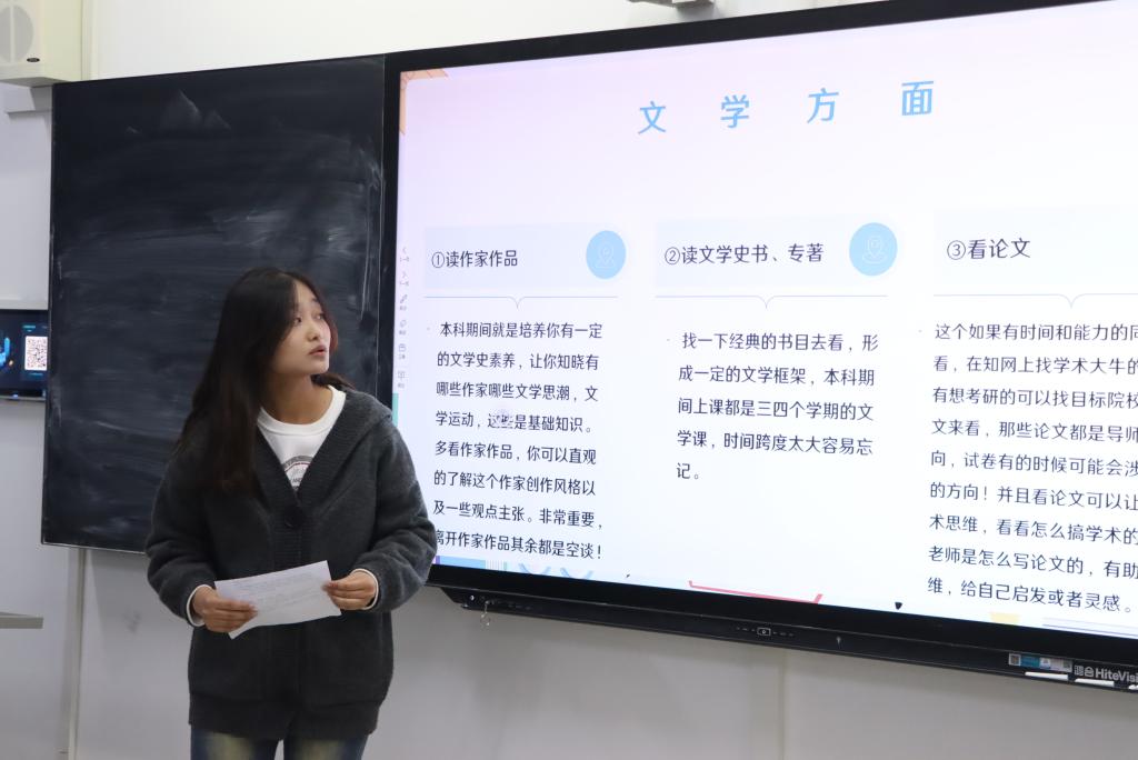 赵娅琪结合个人经历,从创新创业能力、社会工作、荣誉表彰、学院自主、民主评议、附加分等方面向同学们阐述综合素质测评及其重要性,勉励同学们注重培养创新意识和实践能力;王瑞从学习经验和综合素质测评方面入手,结合自己的学习经验,向同学们提出了构建思维导图的方法,同时提出实践操作及阅读作家作品的重要性,积极与老师沟通和交流;赵苹翰分享了自己在学习和生活中遇到问题并解决问题的经历,鼓励同学们要积极参与校园活动,拓展自己的视野,增强人际交往的能力;田欣茹详细介绍了自己的学习方法,强调了合理规划时间,积极主动学习以及善于总结归纳的重要性。