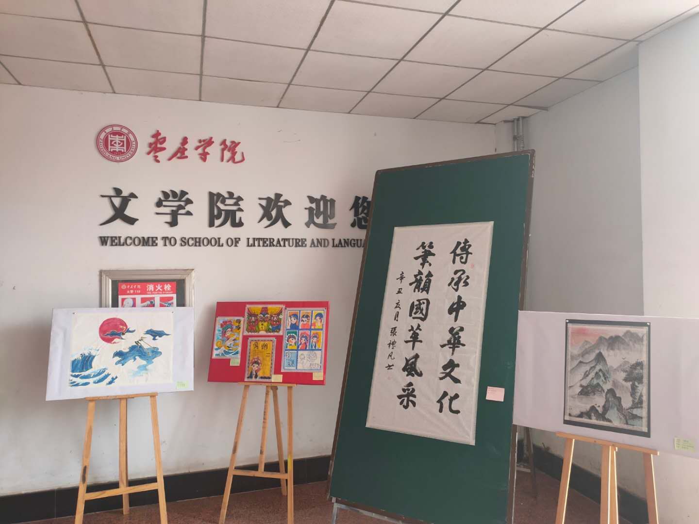 为传承中华文化,丰富课余生活,6月15日,SUNBET申博在文科楼一楼二楼大厅举办“传承中华文化,笔韵国潮风采”书画作品展。