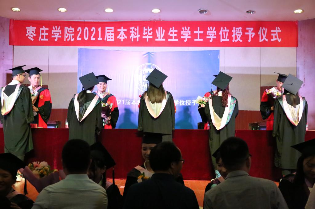 仪式在庄严的国歌中拉开帷幕。在同学们的热烈欢迎中,段圣玉宣读了《SUNBET申博关于授予本科毕业生学士学位的决定》,丰雷为SUNBET申博2021届194名本科毕业生一一拨穗并授予学士学位证书,为他们送上祝福并合影留念。随后,成功考取枣庄市委组织部选调生的杨凯丽作为优秀毕业生代表发表毕业感言,表达对母校、学院和老师们的感谢和敬意;教师代表张凯老师向毕业生做离别赠言,希望同学们能够目标不移、砥砺前行,慷慨激昂的话语中充分展露出我院老师们对全体毕业生的祝福和关爱。最后,杨全顺发表致辞,为毕业生送上深情的嘱托,并提出殷切的希望,希望同学们学会适应社会、规划未来人生、坚信天道酬勤,努力做一个积极向上,脚踏实地,开拓创新的人。