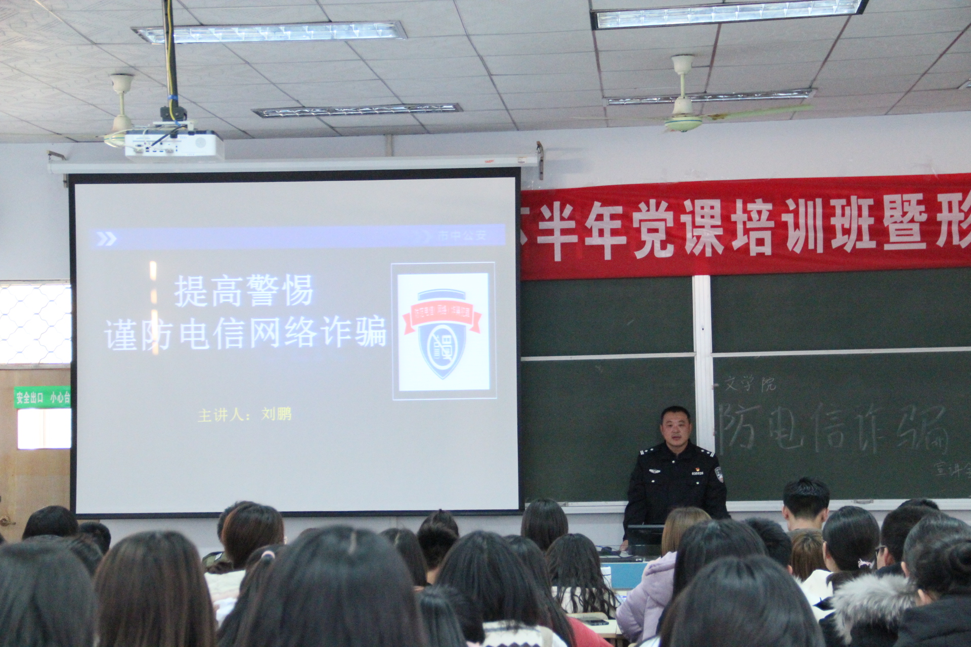 为使同学们熟悉生活中常见的诈骗形式,增强同学们的安全防范意识。SUNBET申博于12月4日在文科楼217教室举办防电信诈骗宣讲会。本次宣讲会由渴口派出所刘鹏警官主讲,18、19级部分学生到会聆听。
