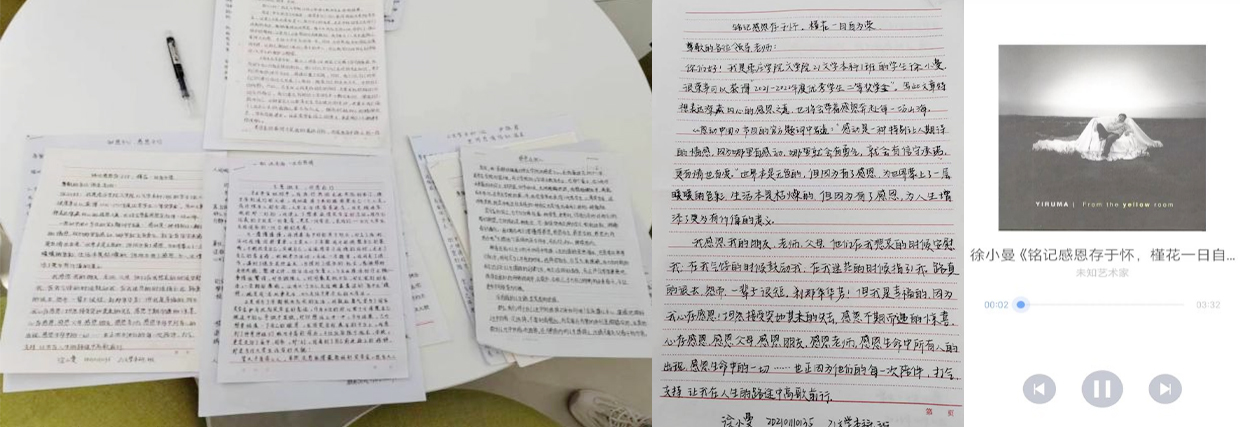 获得奖学金、助学金的同学以手写信和朗诵的形式,用真挚的情感手写信件,饱满的感情朗诵,感恩父母、学校、社会与国家。行行情真意切的文字,恰是幅幅感人至深的生活剪影,句句情感饱满的言语,是永怀感激的心灵迸发。活动共收到56份投稿,在同学们的投稿中写到,奖学金、助学金的支持不仅是物质上的,也是精神上的鼓励和鞭策,还传递着国家的责任感和社会的公德。作为新时代大学生,要感恩父母、学校和社会,领悟其蕴涵的精神实质,常怀感恩之心,常言感恩之情,常做感恩之事。许多同学在信中郑重承诺,在今后的学习生活中积极参加学校、社区志愿者活动,用实际行动回报社会,传递爱心,努力成为立大志,明大德,成大才,担大任的时代新人。