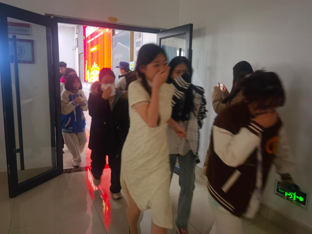 培训中,朱教官组织同学们进行了消防安全疏散逃生演练。随着教官的一声令下,同学们用湿毛巾捂住口鼻,迅速有序地从通道口逃离火灾现场,老师们对学生进行紧急疏散,避免发生拥挤现象。