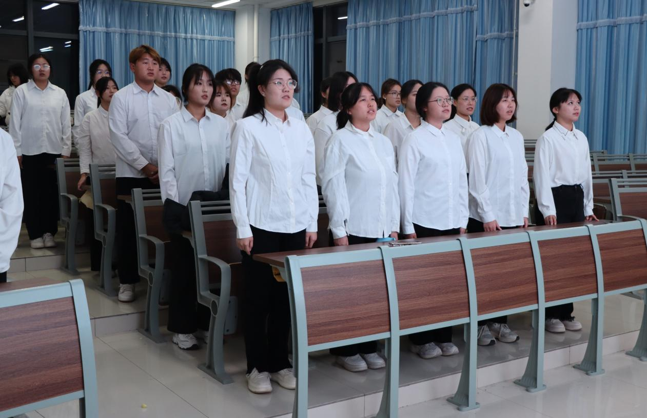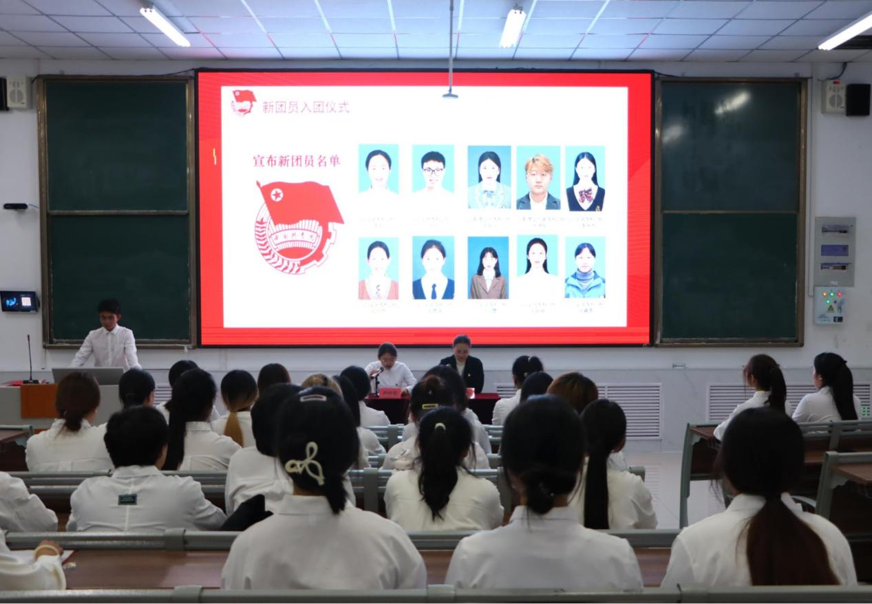 入团仪式在庄严的国歌声中拉开帷幕,乔梓芸宣读新发展团员名单,王元元为新团员佩戴团徽,王晨晓带领新发展团员庄严宣誓,优秀团员代表乔玥和新团员代表戴恩祺先后发言,号召团员青年努力学习,接续奋斗。