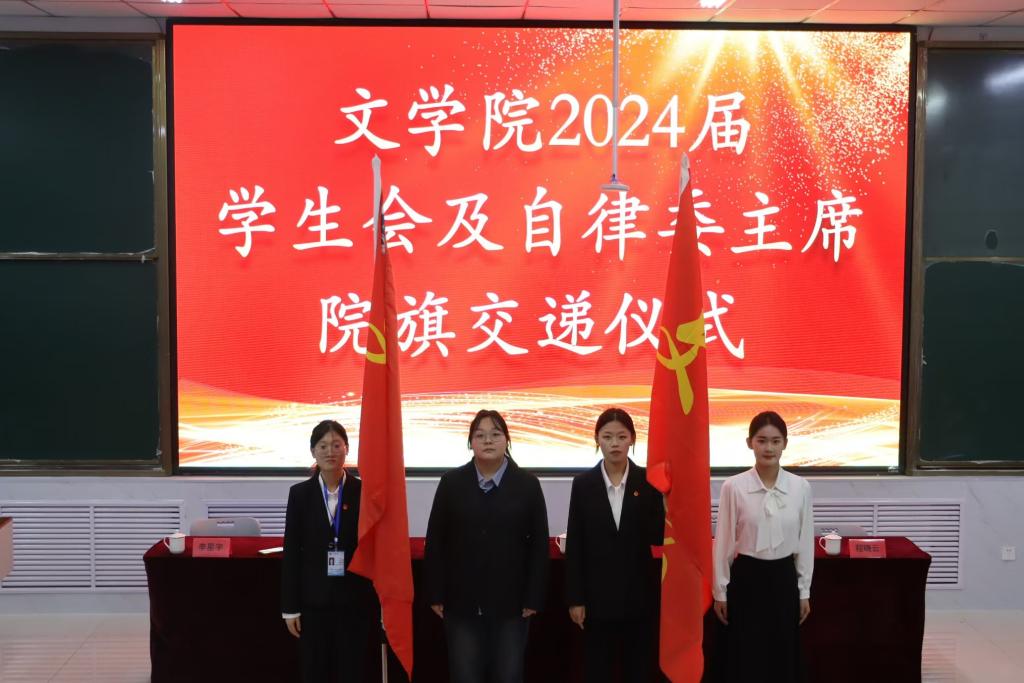 会上,杨晓雅、赵小倩分别宣读《SUNBET申博2024届学生会成员名单》和《SUNBET申博2024届自律委成员名单》,依次为新一届学生干部颁发聘书,2023届主席与新任主席进行院旗交接仪式,新任学生会、自律委主席团与各部部长进行挂牌,新任主席乔玥、马莹对过去的工作表示肯定,并强调之后在工作中会脚踏实地,锐意进取,再创文院佳绩。