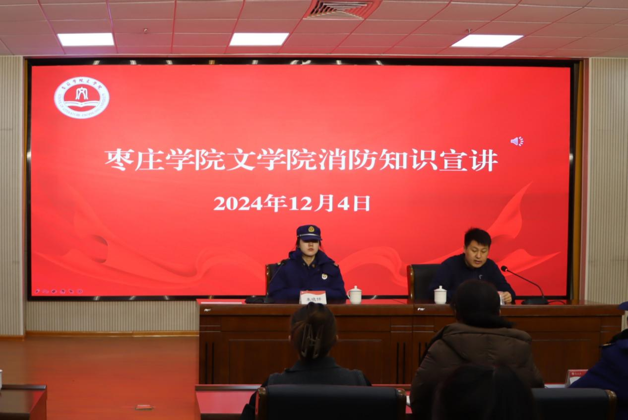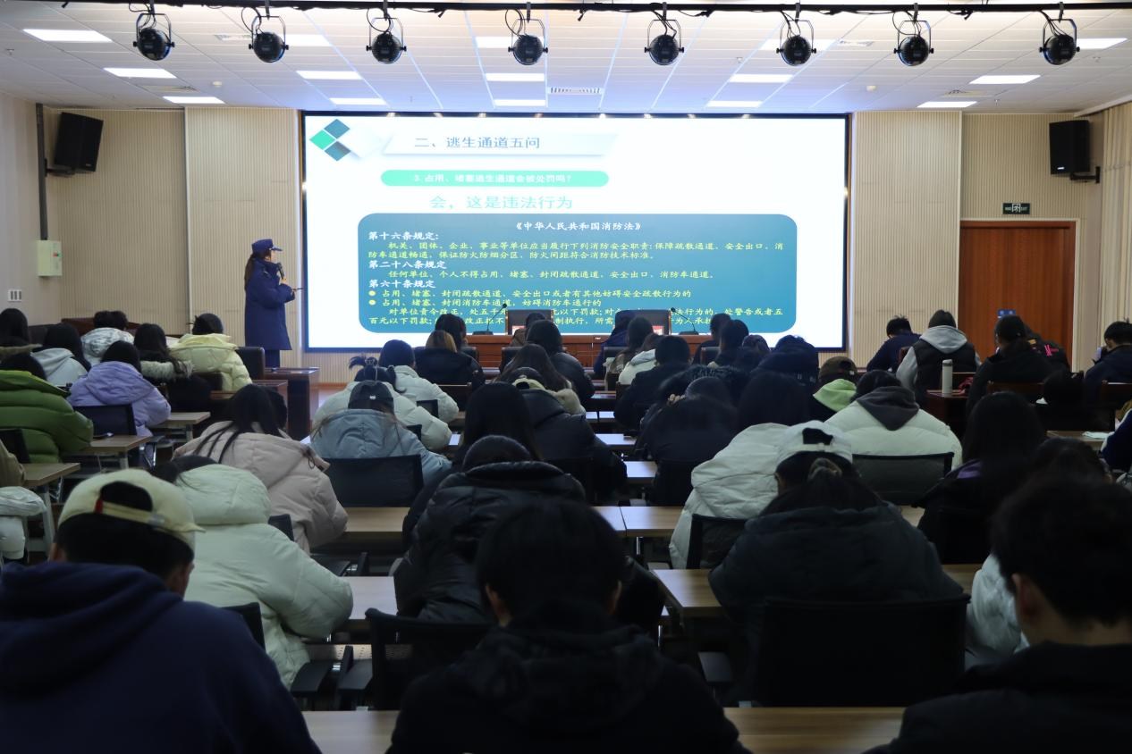 为进一步贯彻落实学校安全稳定工作会议精神,增强师生消防安全意识,提高消防安全应急处理和逃生自救能力,12月4日下午,SUNBET申博邀请枣庄市薛城区消防救援大队警官朱俊思、朱晓仟来校为开展消防安全知识宣讲与疏散演习活动。