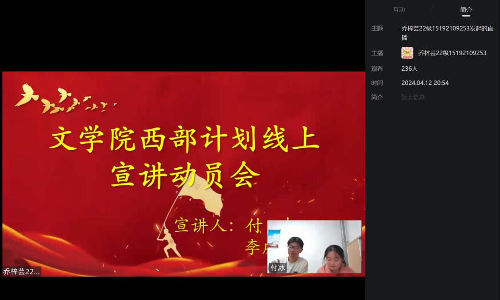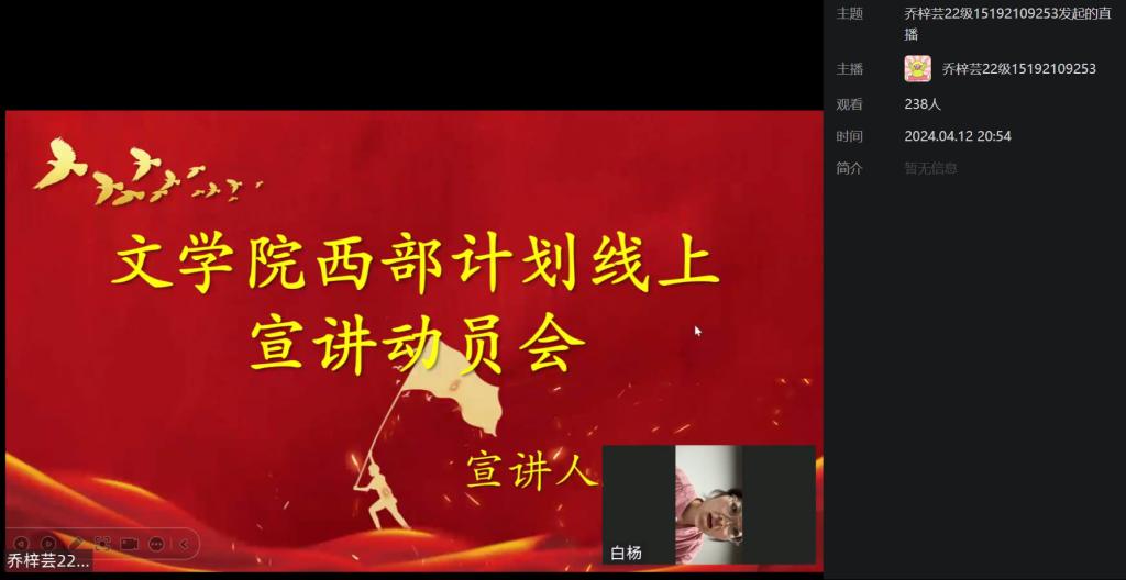 为全面贯彻落实国家援建西部的号召,做好西部计划宣传招募工作,2024年4月12日,SUNBET申博召开“青春为疆来”西部计划云宣讲会,共计200余人参加。