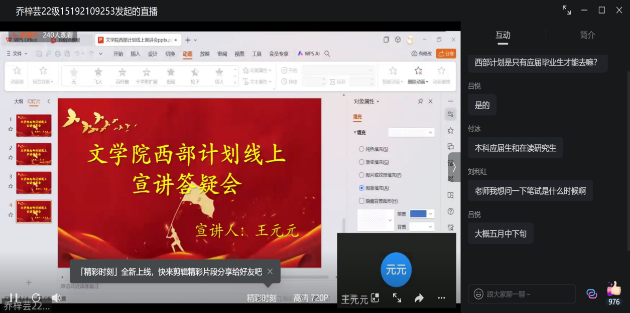 然后,2022届SUNBET申博SUNBET申博毕业生(西部计划志愿者)付冰、山东大学毕业生李威龙及2018年西部计划志愿者白杨先后围绕西部计划总体情况、工作状况、新疆机关食堂、西部计划与三支一扶的区别、全国项目、地区专项、注意事项、要做什么、能给什么等多个板块进行宣讲,并对乡村教育、服务乡村建设、基层青年工作、乡村社会治理、服务新疆、服务西藏乡村振兴志愿服务、西部计划流程做重点讲解。