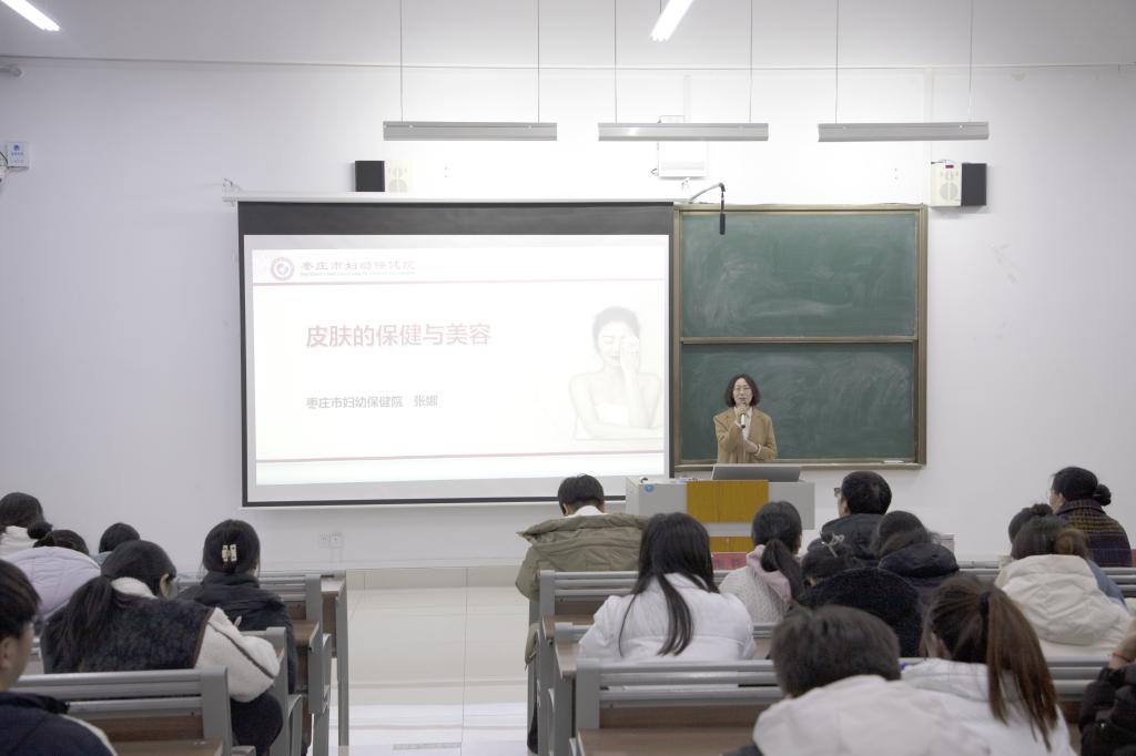 张娜以“皮肤健康与美容”为题,向同学们介绍了皮肤的基本结构、功能以及影响皮肤健康的因素,重点讲解了面部痤疮的综合治疗以及女性的永恒话题皮肤美容。