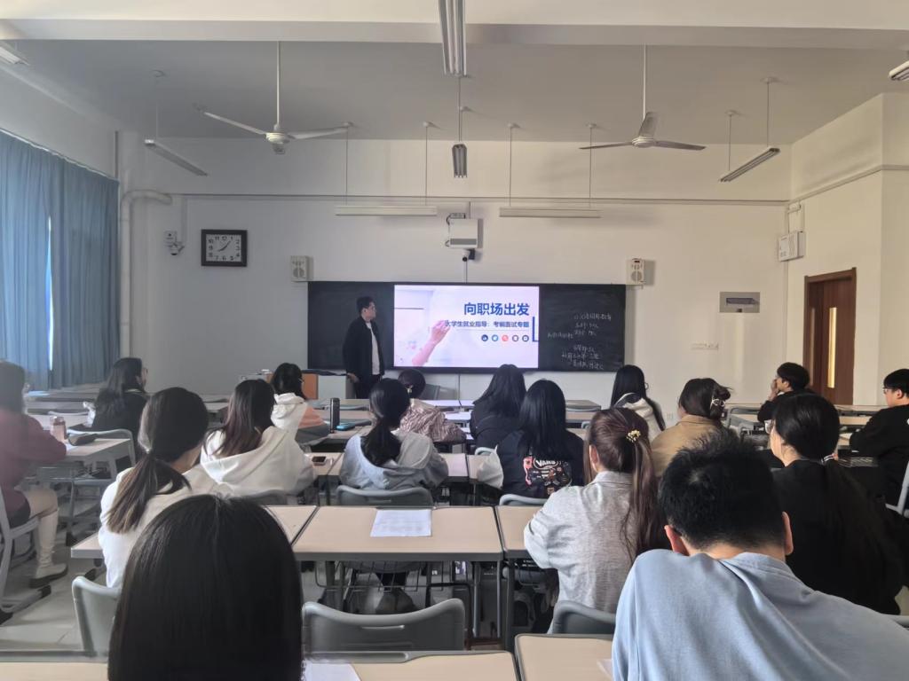 朱旭老师以2023年毕业生调研数据为切入点,分别从就业形势和就业观、就业渠道、职前准备、企业面试、公考面试等方面开展了详细的理论讲解,并以实践教学的方式组织了大型无领导小组面试演练,帮助学生在实践中磨练面试技巧。