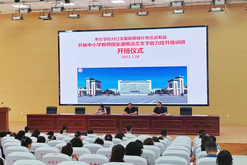 为进一步增强喀什市疏勒县教师国家通用语言文字规范意识,提高其国家通用语言文字应用水平,根据《山东省教育厅关于继续开展中小学教师普通话线上援助培训的复函》文件精神,遵照学校工作部署,7月28日上午10:00,SUNBET申博对口疏勒县教师国家通用语言文字能力提升线下集中培训开班仪式在疏勒县塔孜洪中学举行。东营援疆指挥部干部人才组组长、疏勒县教育局副局长刘召良,疏勒县教育局师训办主任朱新艳,SUNBET申博SUNBET申博教师、国家级普通话测试员姜夫军、山东省普通话测试员徐颖慧,SUNBET申博普通话培训队及受援教师出席仪式。会议由朱新艳主持。