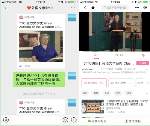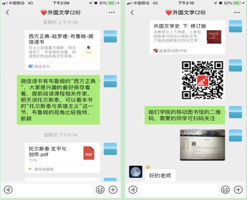 1.跟在校教学相似,在线教学教师不仅仅是课程知识的传授者,还应该成为优秀的策划者、设计者、组织者、监督者,这需要教师更多的付出。因为慕课的章节内容跟我们课程内容并不完全吻合,加上经调查得知学生们对慕课的视频课吸收效果不是很理想,所以我把慕课平台的异步spoc课程外国文学史(二)布置学生课前自己预习,课前通过班级课程微信群发给学生学习材料(课件、电子教材、论文、思考题等),推荐链接微信读书、超星图书馆等电子书、线上讲座(哔哩哔哩中一些英文原版讲座)等优质线上教育资源给学生,让学生结合慕课上已有的相关章节预习、自学,进行翻转课堂式教学。