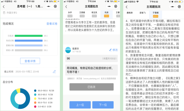 第四周张泽慧同学问的问题很有价值,我在直播课中及时解答她所疑惑的“由《傲慢与偏见》所引发的关于‘教育对人们思想观念变革的影响’”这一问题,拓展学生的思路。平时还通过微信给有问题的同学答疑解惑。在雨课堂和长江雨课堂布置讨论题等线上主观作业,已一一批改反馈。下周计划布置读书笔记和书评等在线作业。