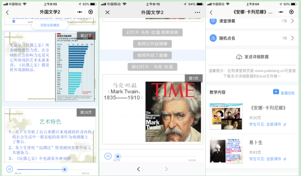 因为疫情影响,在线开展教学五周以来,我利用我所导入、建设的中国慕课平台的spoc课程“外国文学史(二)”(作为课下预习使用)、自己制作的精良课件在雨课堂(上周开始使用可以录屏的新版长江雨课堂)、腾讯会议、微信群等平台开展线上直播教学,微信读书、超星图书馆、哔哩哔哩上的优质英文原版慕课等优质线上教育资源作为辅助教学资源,效果良好。
