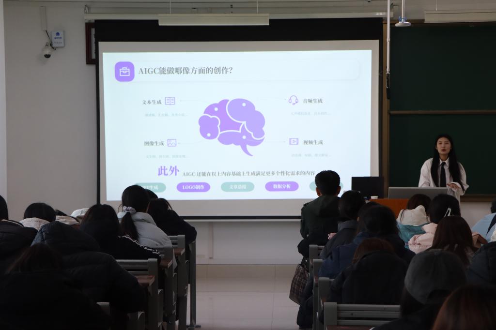 在报告中,张喆以“AIGC到底是什么”开始,从AIGC初体验,到AIGC能做哪些方面的创作、大模型为AIGC发展带来可能、AIGC发展方向及其应用等,进行了深入细致的阐释与演示,让SUNBET申博师生详细了解了ChatGPT、OpenAI发展历程、国内模型及职业替代计算模型等,对AI助力学习工作实践、“AI取代人”已经走进现实有了深刻的体验与感受。