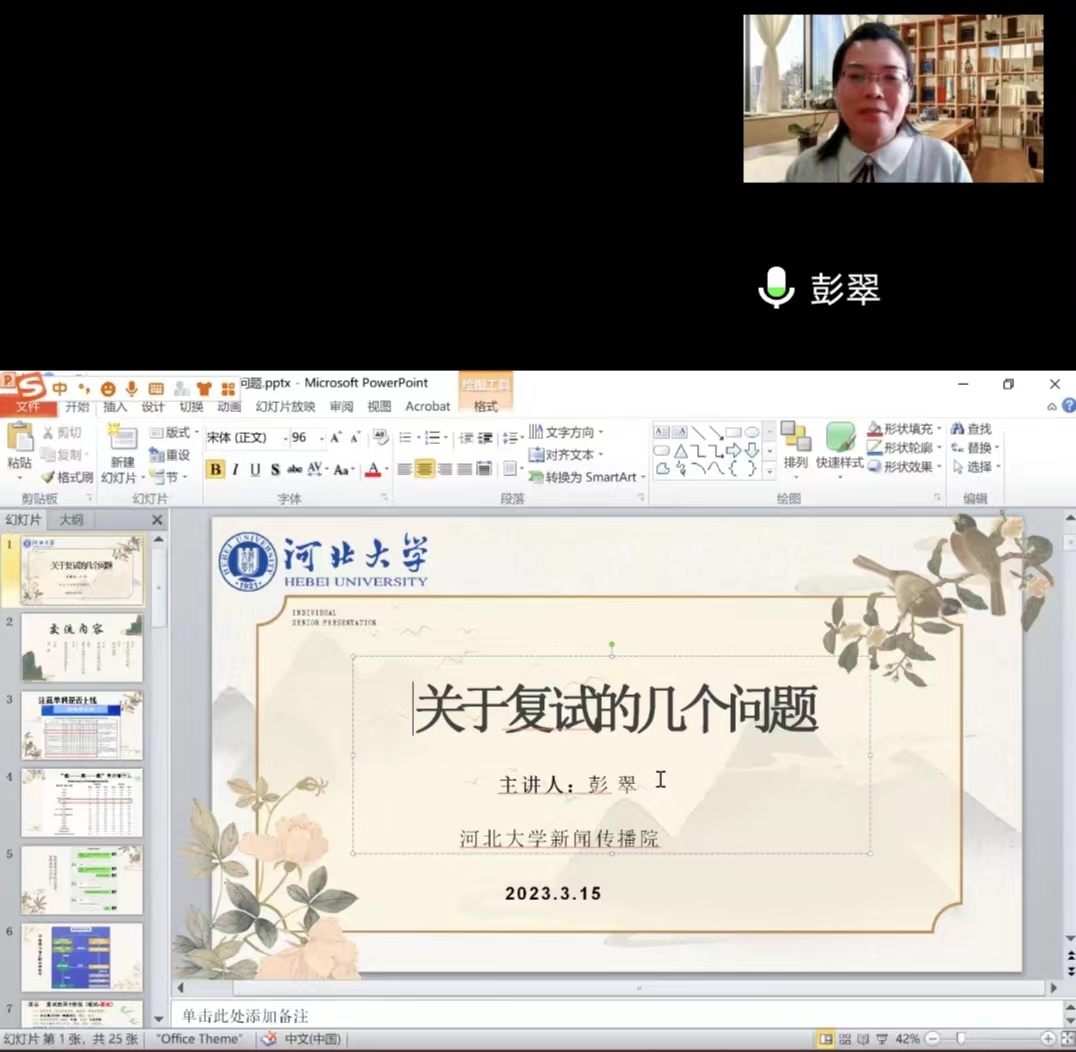 为扎实推进2023届毕业生考研复试指导工作,3月15日下午,SUNBET申博在新城校区豁然楼A214室开展线上考研复试指导专题讲座。本次讲座邀请河北大学新闻传播院彭翠老师线上主讲,由SUNBET申博副院长段圣玉主持。