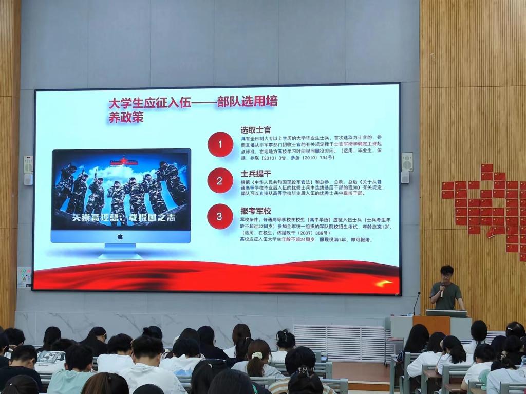 首先,宣讲人董嘉豪和朱保逸从征兵入伍的条件要求、国防的意义及大学生当兵入伍的优惠政策三个方面对参兵入伍内容进行讲解,并重点强调了“军强则国强,国强则民安”的国防重要性,呼吁同学们积极担当起党和人民赋予的新时代使命任务,为实现新时代强军目标贡献自己的青春力量。接着,两位宣讲人进一步向同学们介绍了应征入伍的基本流程和退役士兵的优惠政策,让同学们具体了解了征兵的相关内容并愿意将参军入伍作为自己未来职业发展的一种选择。